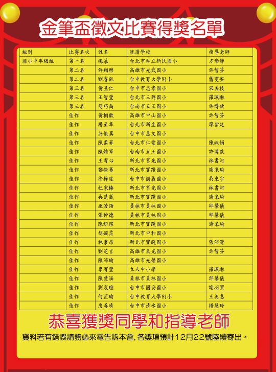 (競賽)2025金筆盃作文大賽得獎名單國小中年級組
